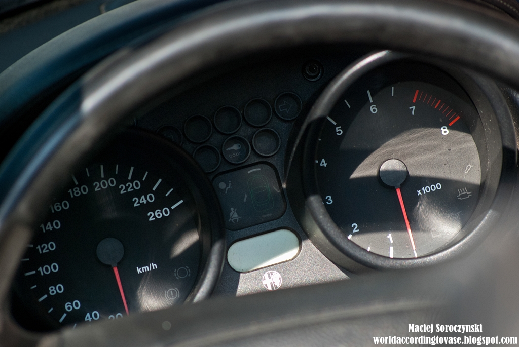 Czas na kilka słów o samym samochodzie. Nigdy nie byłem wielkim fanem Gtv-ek, mimo tego, że miałem okazję oglądać z bliska jedne z najładniejszych jakie jeżdżą po Polsce. Coś mi w tym samochodzie mimo wszystko nie pasowało. Mija kilka lat i mój światopogląd dość mocno się zmienia, jednak nadal nie mogę się przekonać do tej plastikowej deski. Ładnie wygląda, ale jest niezbyt przyjemna w dotyku, a w dodatku trzeszczy na każdej nierówności. Ale to już chyba domena lat z tego okresu. Do Spidera przekonała mnie zupełnie inna rzecz. Jest tu dużo więcej miejsca w środku niż w
